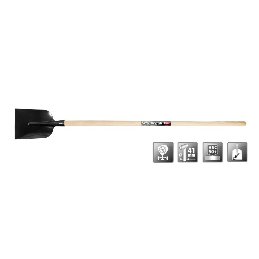 Deze betonschop met essen steel heeft een extra gehard blad in gelegeerd staal dat voorzien is van een aangeslepen snede. Bovendien is het zwarte stalen blad van de schop voorzien van rechte hoeken.