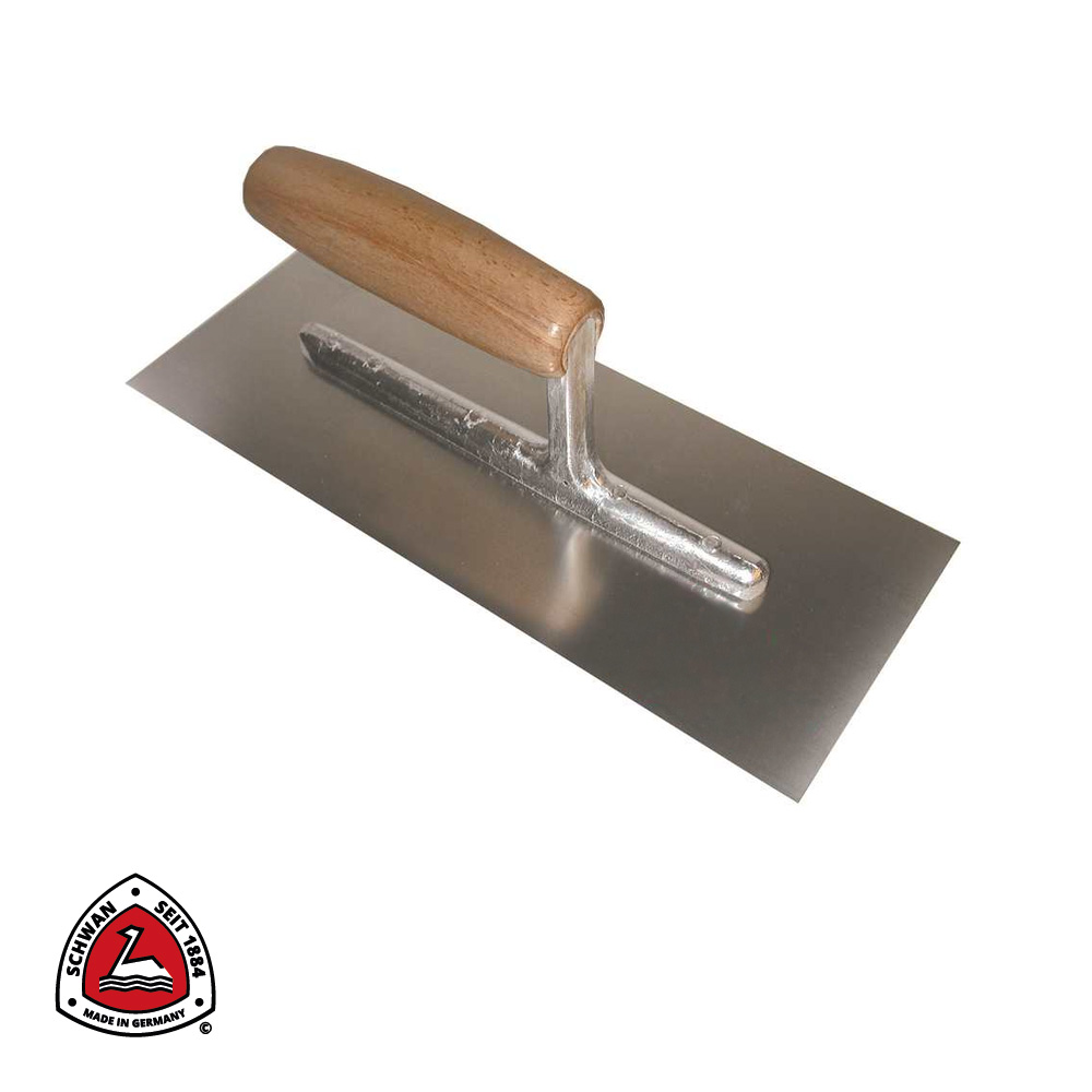 Plakspaan met inox blad en houten handgreep perfect geschikt voor het egaal uitstrijken van stucmortels en lijmmortels bij vloerwerken en voor sierpleisters van de muur te schrapen.