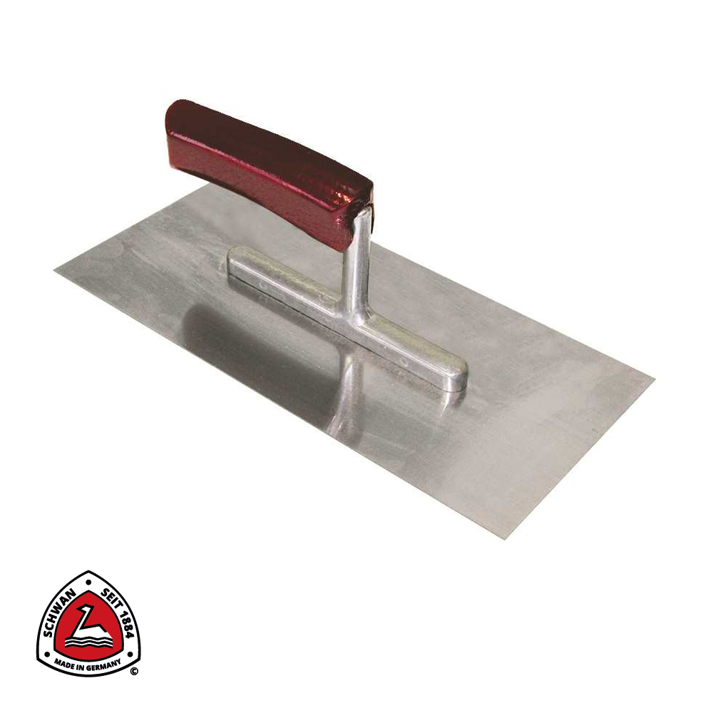 Plakspaan met stalen blad en gebogen houten handgreep perfect geschikt voor het egaal uitstrijken van stucmortels en lijmmortels bij vloerwerken en voor sierpleisters van de muur te schrapen.